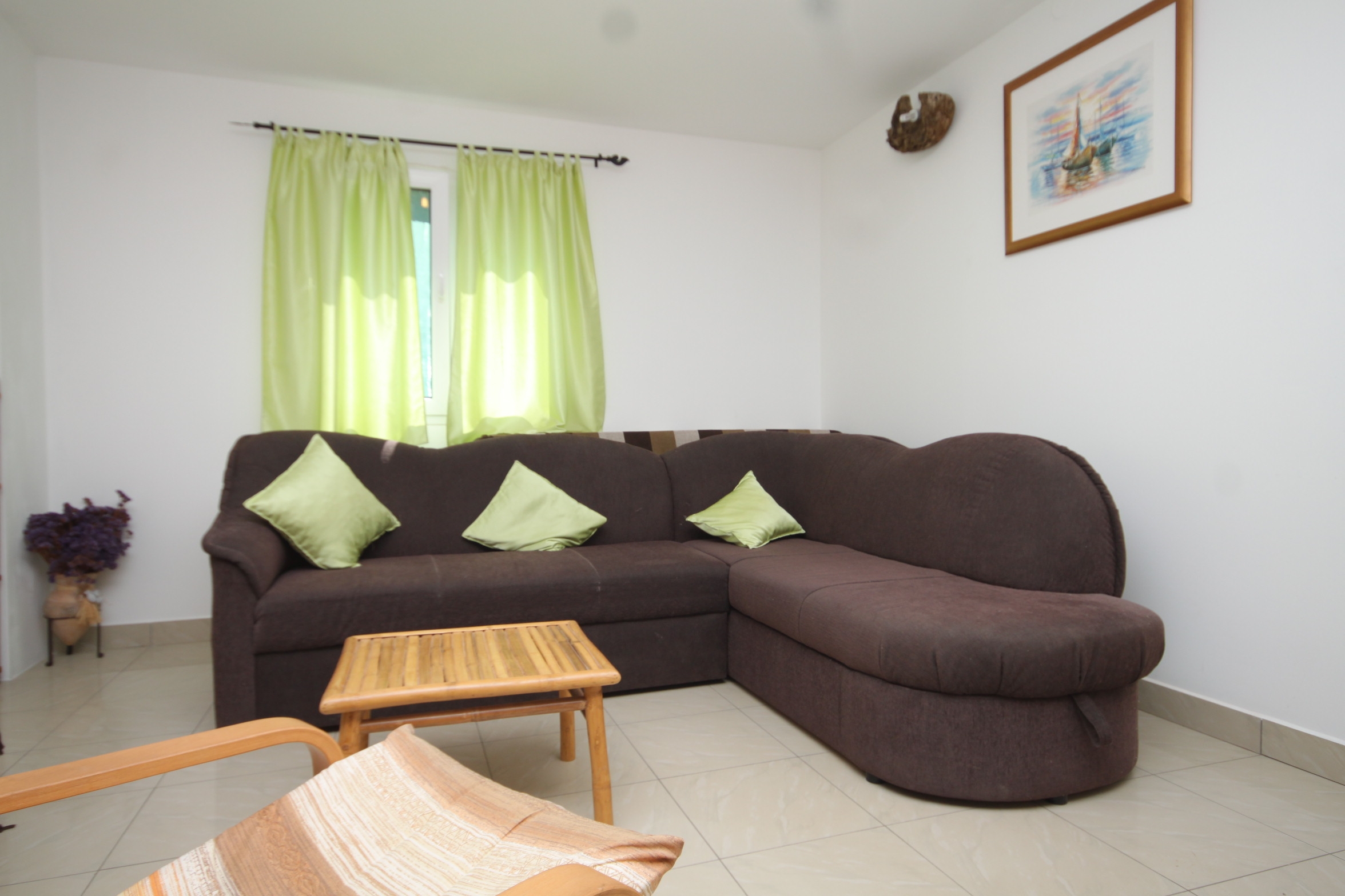 Apartment can accommodate 5 guests. Beds are situated in 1 sleeping rooms, but also in the living room and dining room, within 50m2. Guests can use a private terrace to enjoy the warm summer evenings. The apartment offers the sea view. Food can be prepared using barbecue which is shared with other guests too. This accommodation unit welcomes pets at an additional charge. INCLUDED IN THE PRICE: tourist tax, final cleaning, parking, internet, boat mooring, baby cot, transport to the property (service providers boat), hairdryer, sunchairs. OBLIGATORY ADDITIONAL COSTS: short stay fee (surcharge depending on a number of booked nights: 30% - 1, 20% - 2, 10% - 3). OPTIONAL ADDITIONAL COSTS: pets (€10.00 per night). The availability of additional services for your chosen dates of stay, as well as their prices (if none are listed) must be checked ahead of time. Any additional services not shown in the price calculation are payable directly to the property owner and only if used by the visitor.