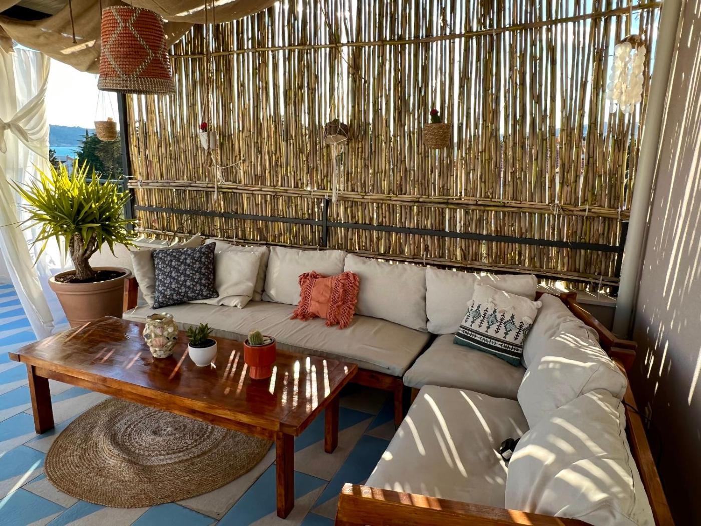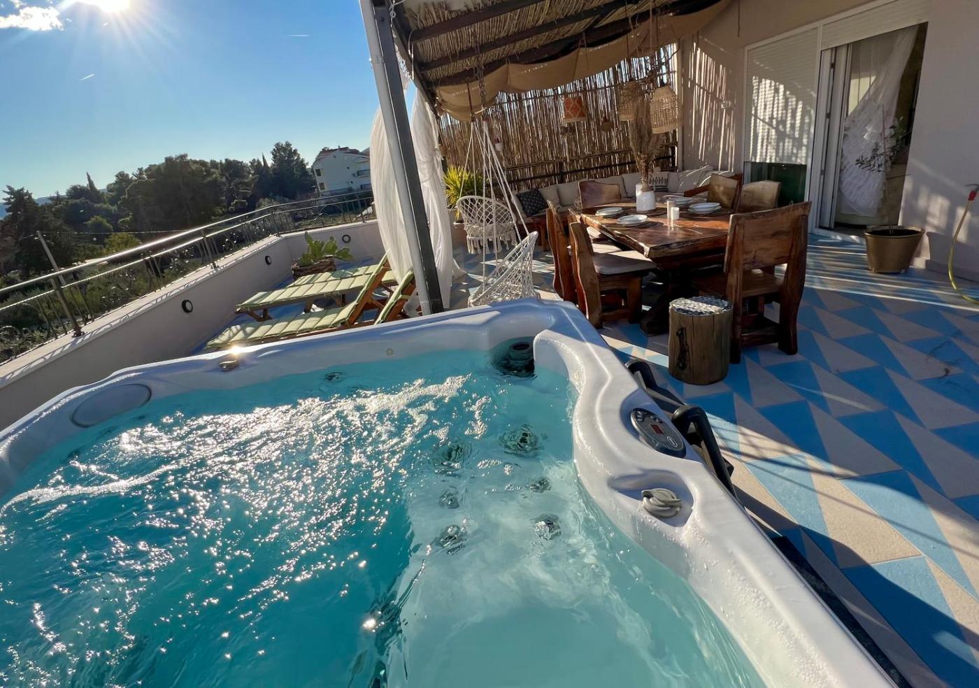 Deluxe Apartment. The hot tub and fireplace are the standout features of this apartment. Featuring a private entrance, this air-conditioned apartment comprises 1 living room, 2 separate bedrooms and 1 bathroom with a bath and a hairdryer. Guests will find a refrigerator, a dishwasher, kitchenware and an oven in the fully equipped kitchen. The apartment also provides guests with a barbecue. The spacious apartment provides a washing machine, a tea and coffee maker, a seating area as well as a terrace with sea views. The unit offers 3 beds. ;