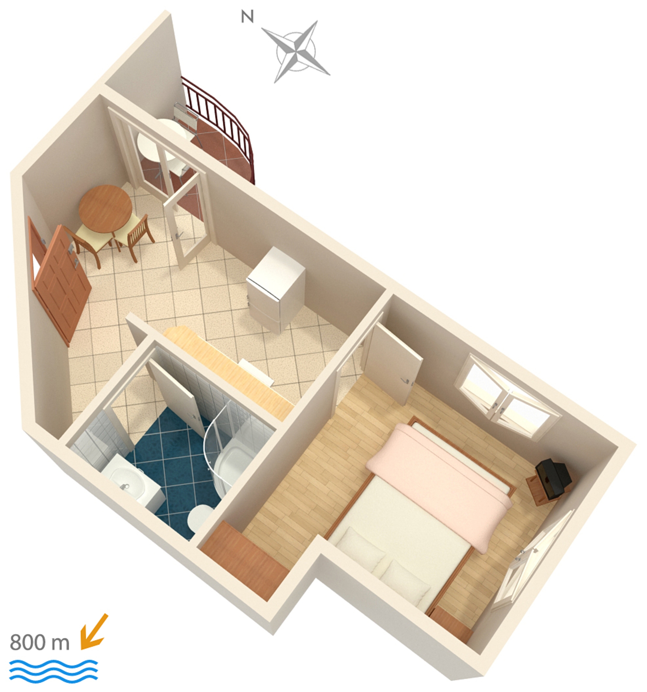 Apartment can accommodate 2 guests. Beds are situated in 1 sleeping rooms, within 20m2. Guests can use a private terrace to enjoy the warm summer evenings. Food can be prepared using barbecue which is shared with other guests too. INCLUDED IN THE PRICE: tourist tax, final cleaning, air-conditioning, parking, internet. OBLIGATORY ADDITIONAL COSTS: short stay fee (surcharge depending on a number of booked nights: 30% - 1, 20% - 2, 10% - 3). The availability of additional services for your chosen dates of stay, as well as their prices (if none are listed) must be checked ahead of time. Any additional services not shown in the price calculation are payable directly to the property owner and only if used by the visitor.