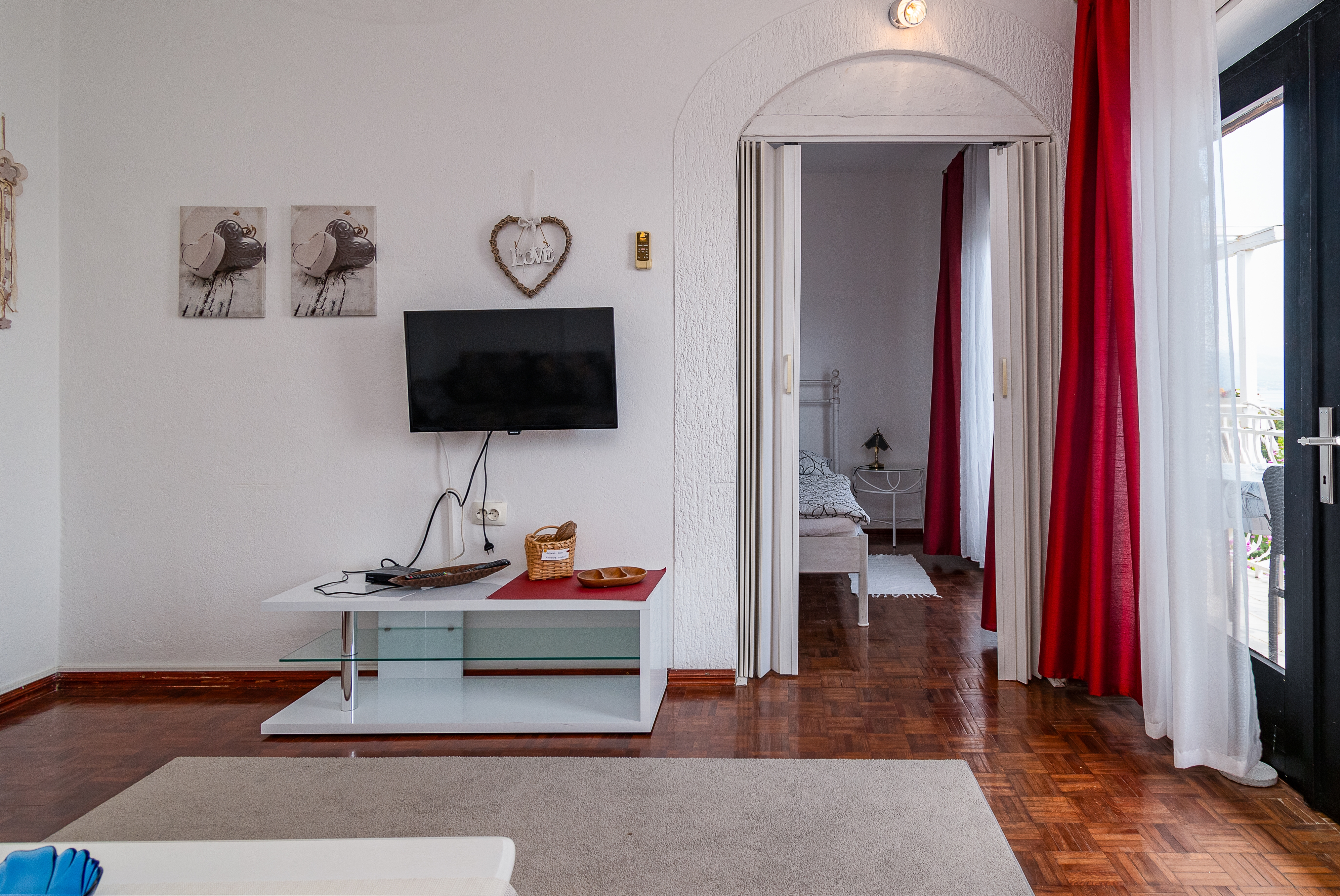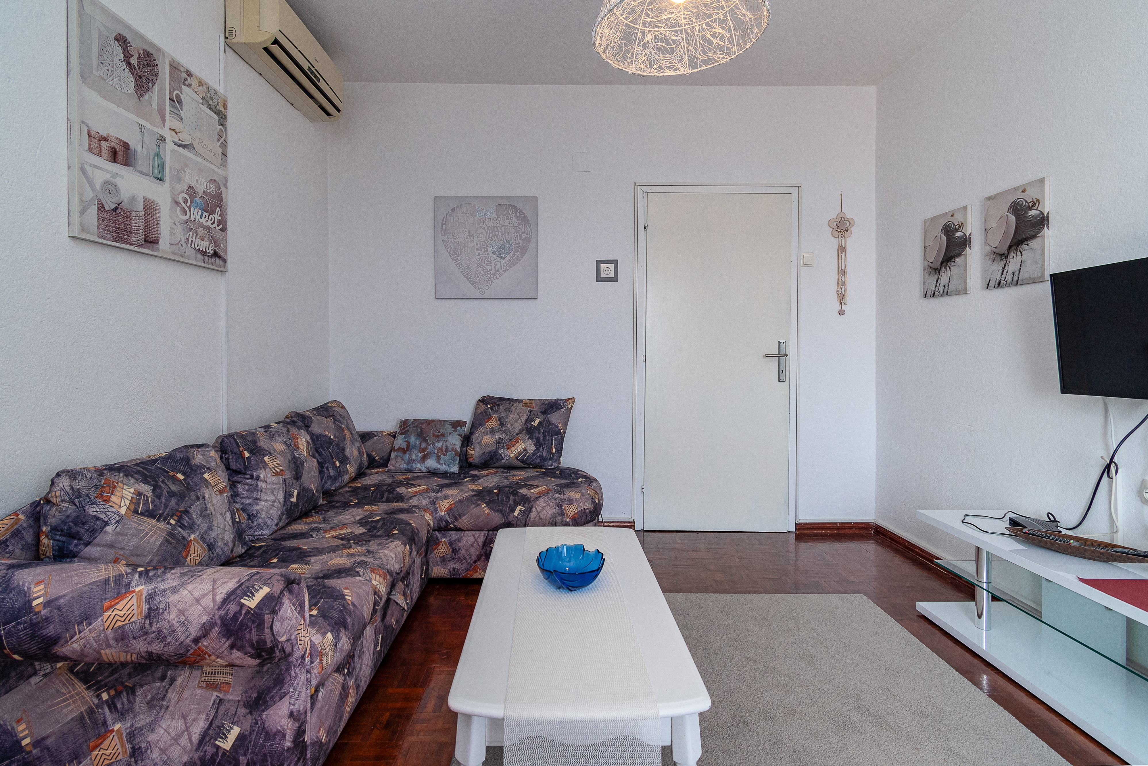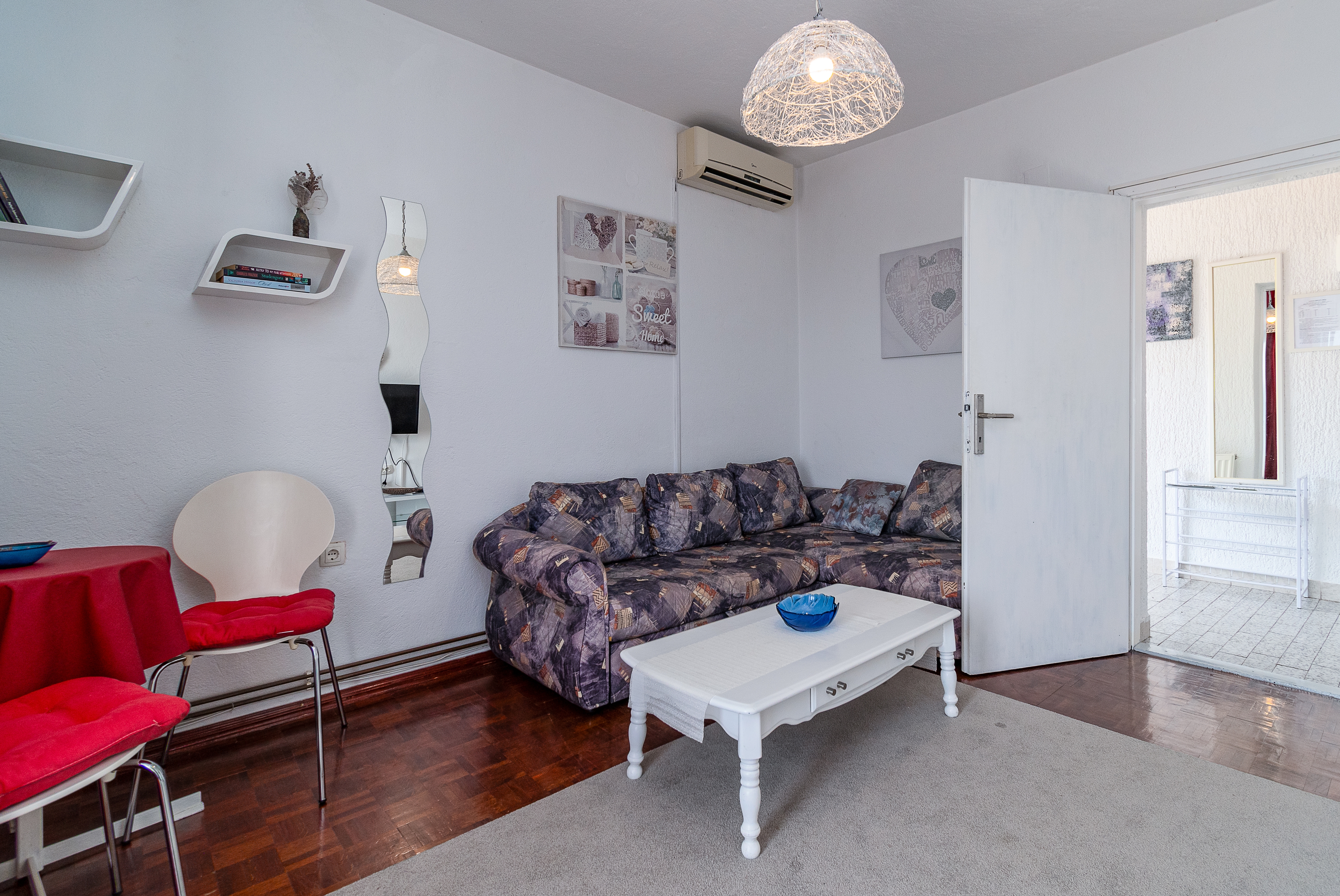 Apartment can accommodate 3 guests. Beds are situated in 1 sleeping rooms, but also in the living room, within 39m2. Guests can use a private balcony to enjoy the warm summer evenings. The apartment offers the sea view. Food can be prepared using barbecue which is shared with other guests too. Shared pool is on disposal during stay. Reserved accommodation unit has a shared terrace. INCLUDED IN THE PRICE: tourist tax, final cleaning, air-conditioning, pool, parking, internet. The availability of additional services for your chosen dates of stay, as well as their prices (if none are listed) must be checked ahead of time. Any additional services not shown in the price calculation are payable directly to the property owner and only if used by the visitor.