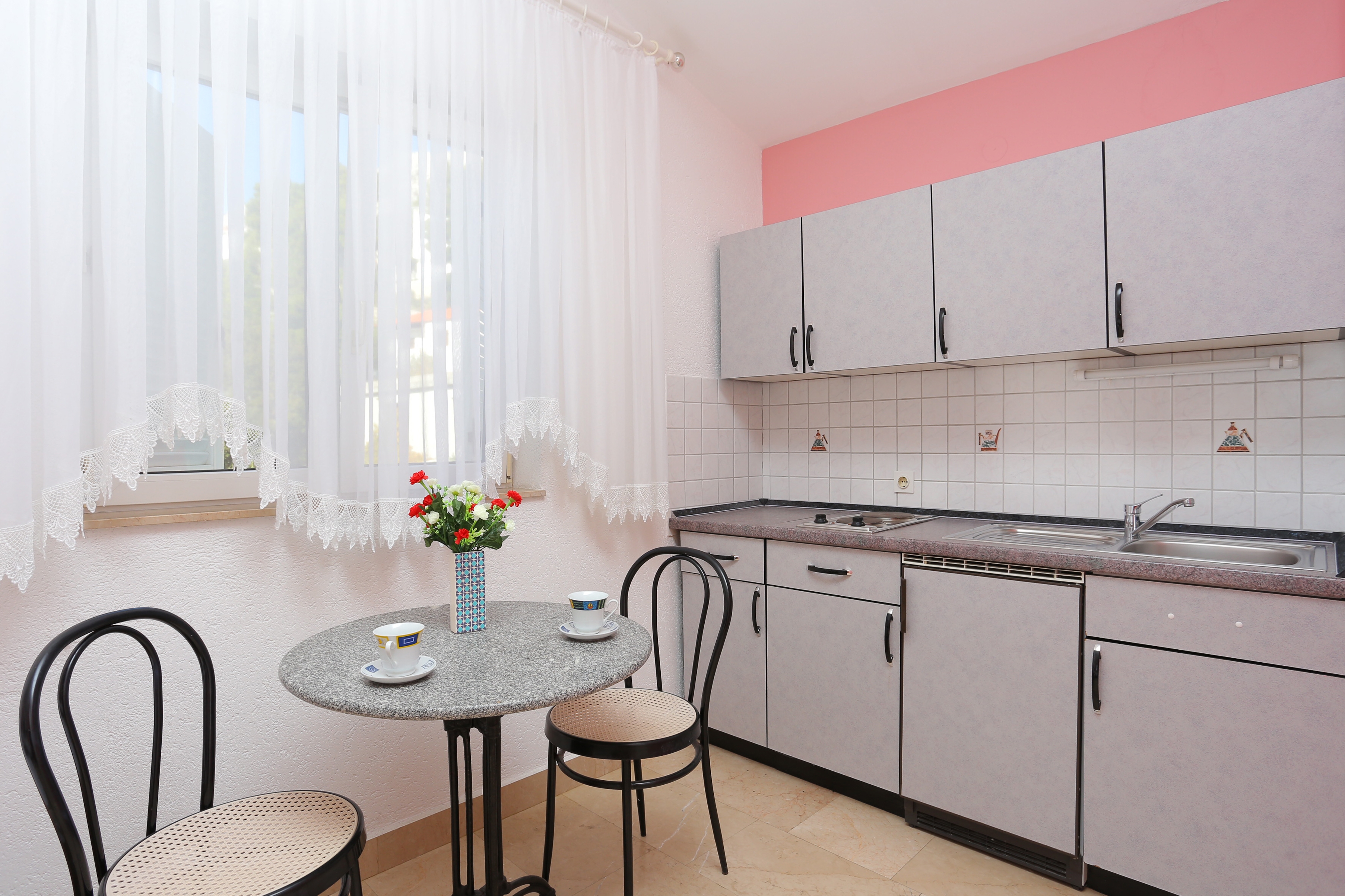 Studio flat can accommodate 3 guests. Beds are situated in 1 sleeping rooms, within 22m2. Guests can use a private balcony to enjoy the warm summer evenings. The studio offers the sea view. Food can be prepared using barbecue which is shared with other guests too. INCLUDED IN THE PRICE: tourist tax, final cleaning, air-conditioning, parking, internet, baby cot, iron, ironing board, hairdryer, portable barbecue. OBLIGATORY ADDITIONAL COSTS: short stay fee (surcharge depending on a number of booked nights: 30% - 1, 20% - 2, 10% - 3). OPTIONAL ADDITIONAL COSTS: laundry (€3.00 washing), additional bed (€5.00 per night). The availability of additional services for your chosen dates of stay, as well as their prices (if none are listed) must be checked ahead of time. Any additional services not shown in the price calculation are payable directly to the property owner and only if used by the visitor.