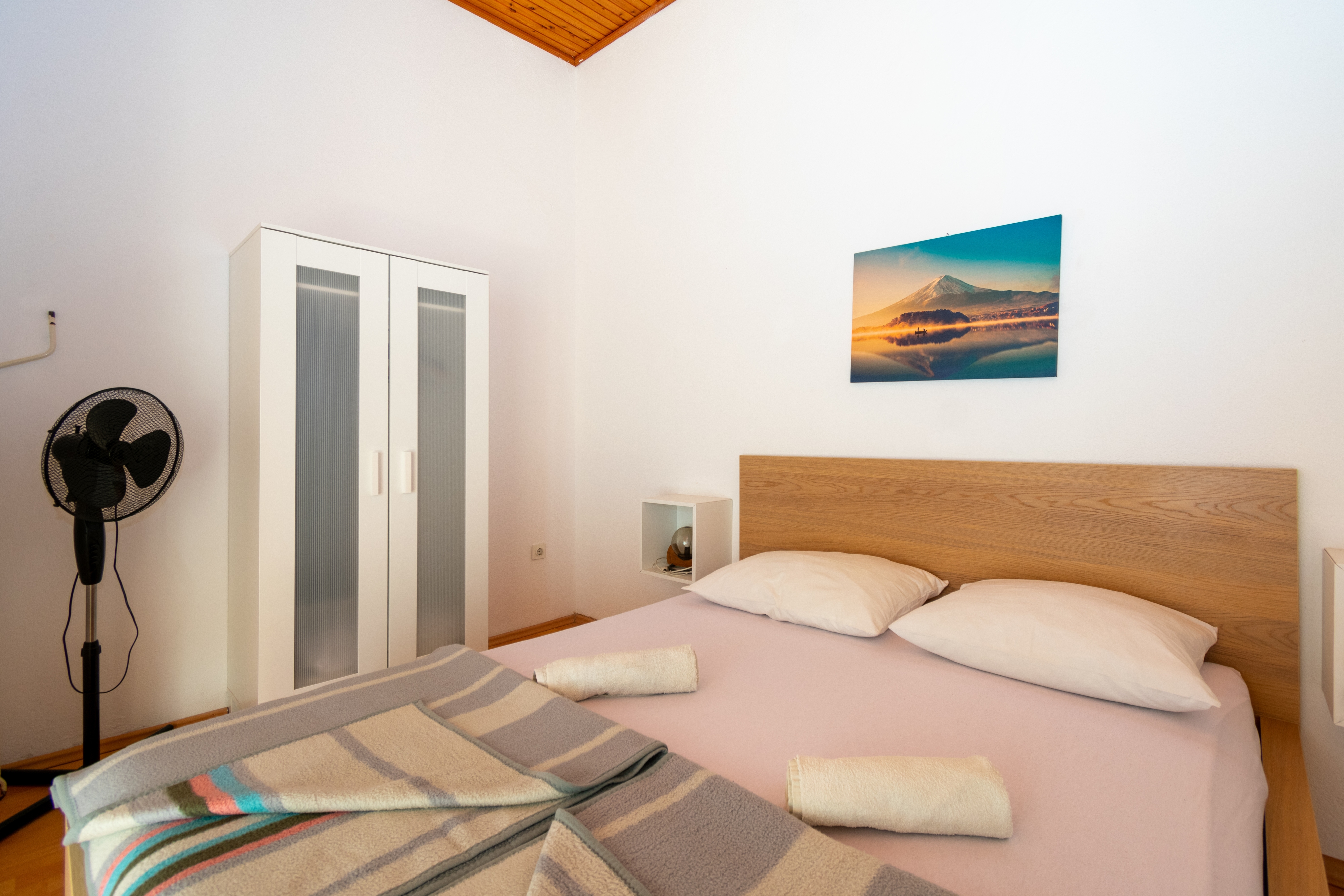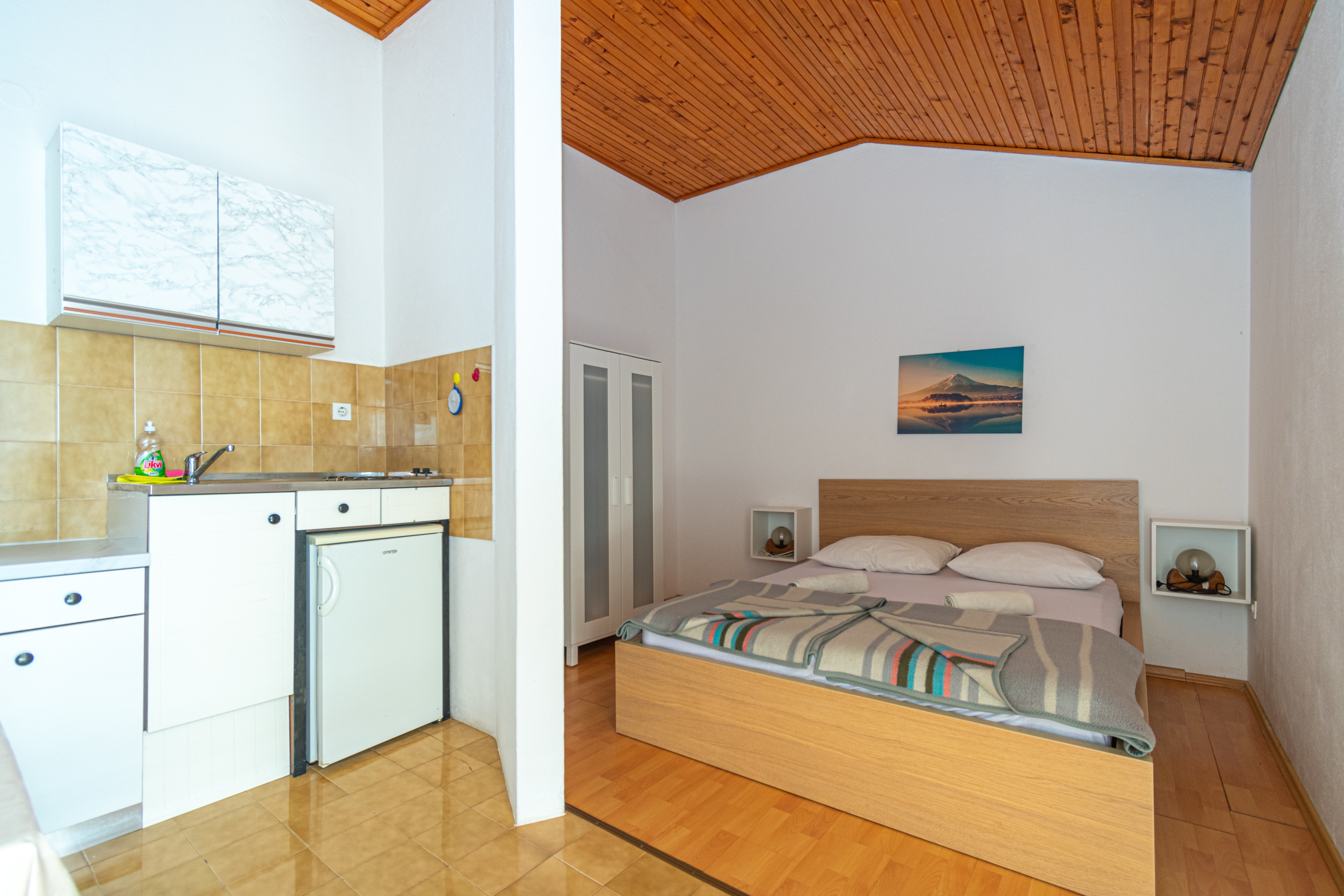 Studio flat can accommodate 2 guests. Beds are situated in 1 sleeping rooms, within 18m2. Guests can use a private balcony to enjoy the warm summer evenings. The studio offers the sea view. Food can be prepared using barbecue which is shared with other guests too. This accommodation unit welcomes pets at an additional charge. INCLUDED IN THE PRICE: tourist tax, final cleaning, parking, internet, additional bed. OBLIGATORY ADDITIONAL COSTS: short stay fee (surcharge depending on a number of booked nights: 30% - 1, 20% - 2, 10% - 3). OPTIONAL ADDITIONAL COSTS: pets (€3.00 per night). The availability of additional services for your chosen dates of stay, as well as their prices (if none are listed) must be checked ahead of time. Any additional services not shown in the price calculation are payable directly to the property owner and only if used by the visitor. Discounts to the base price: free day 14=13 (for reservations of 14 or more days you get one free day for the stay until 31122026).