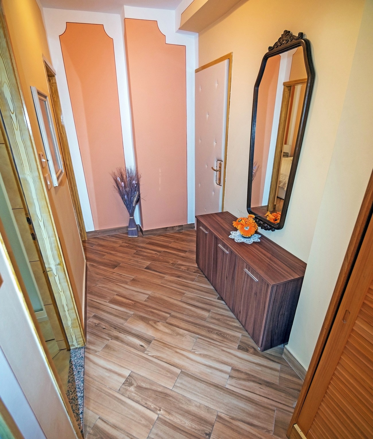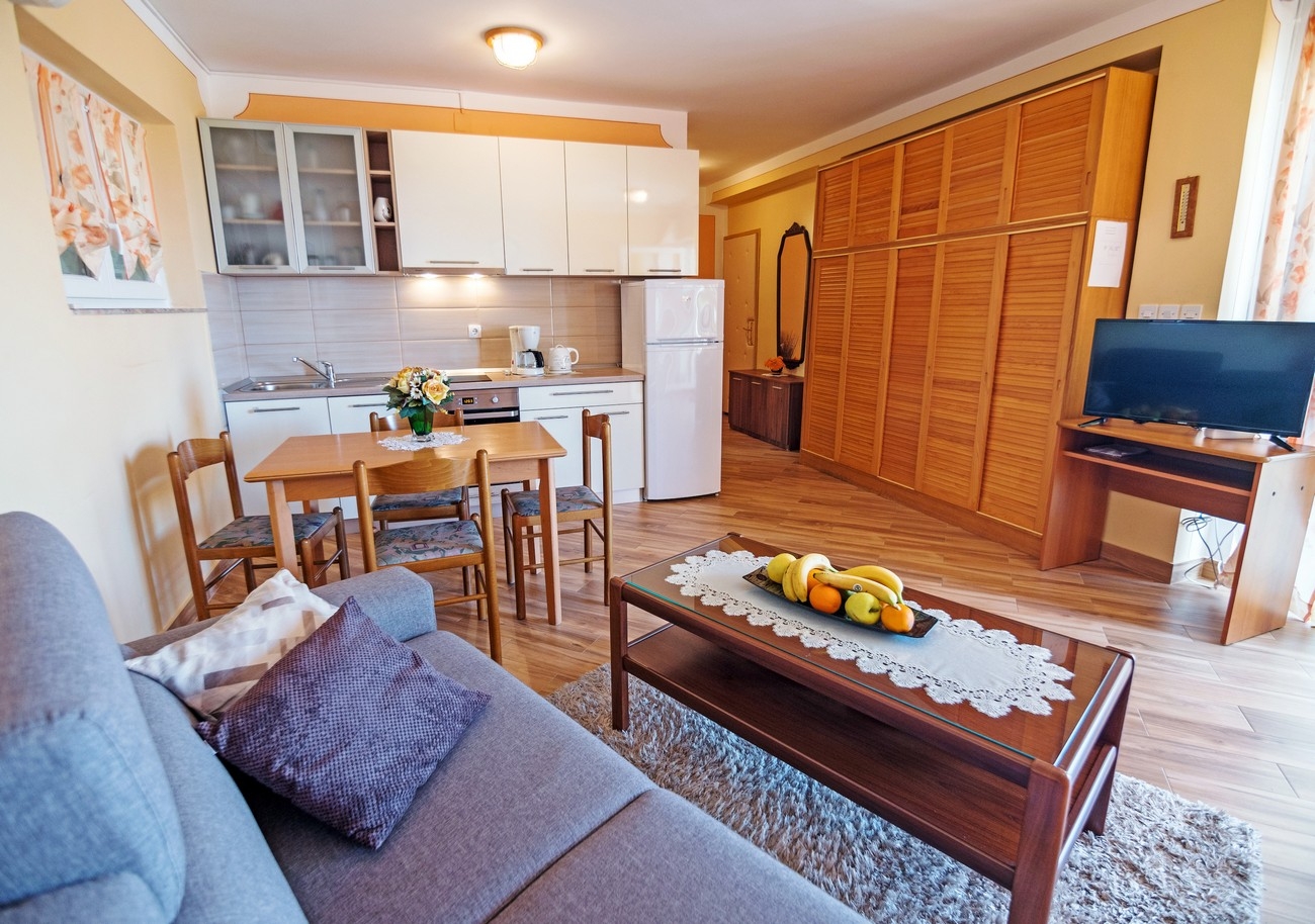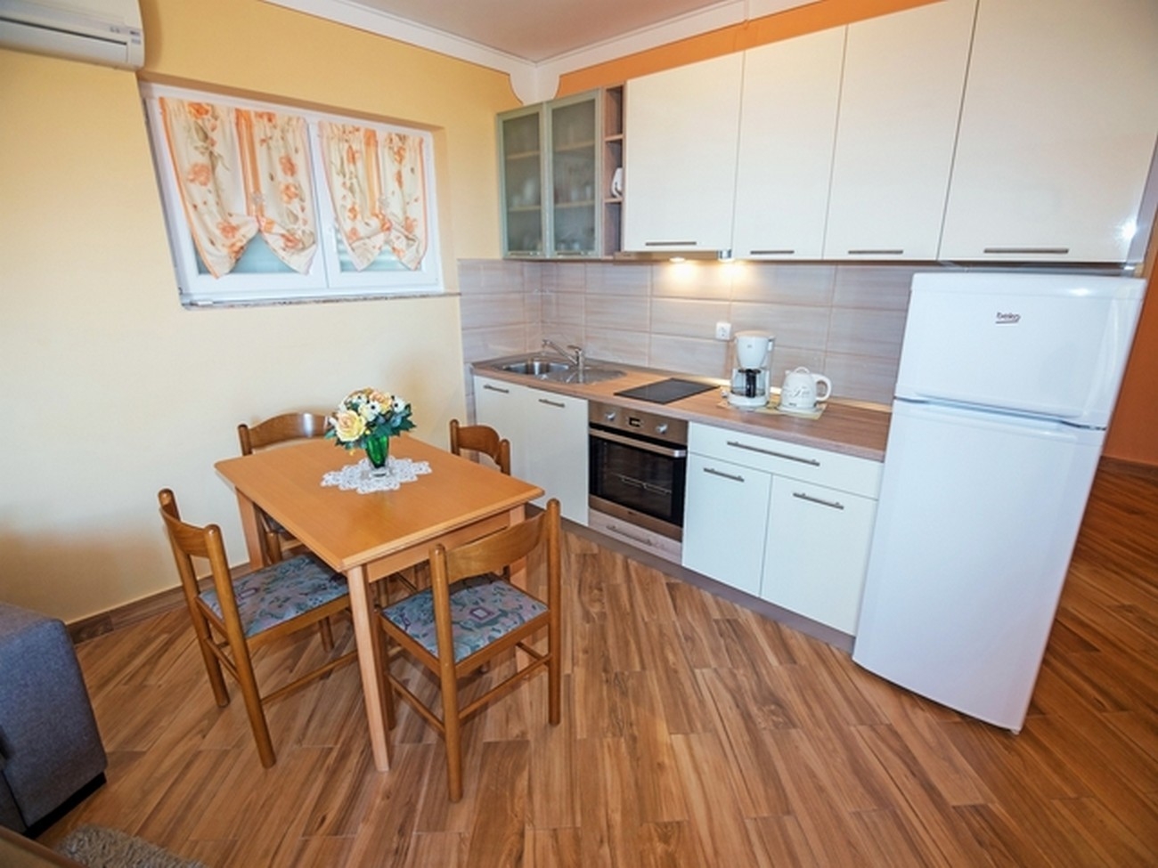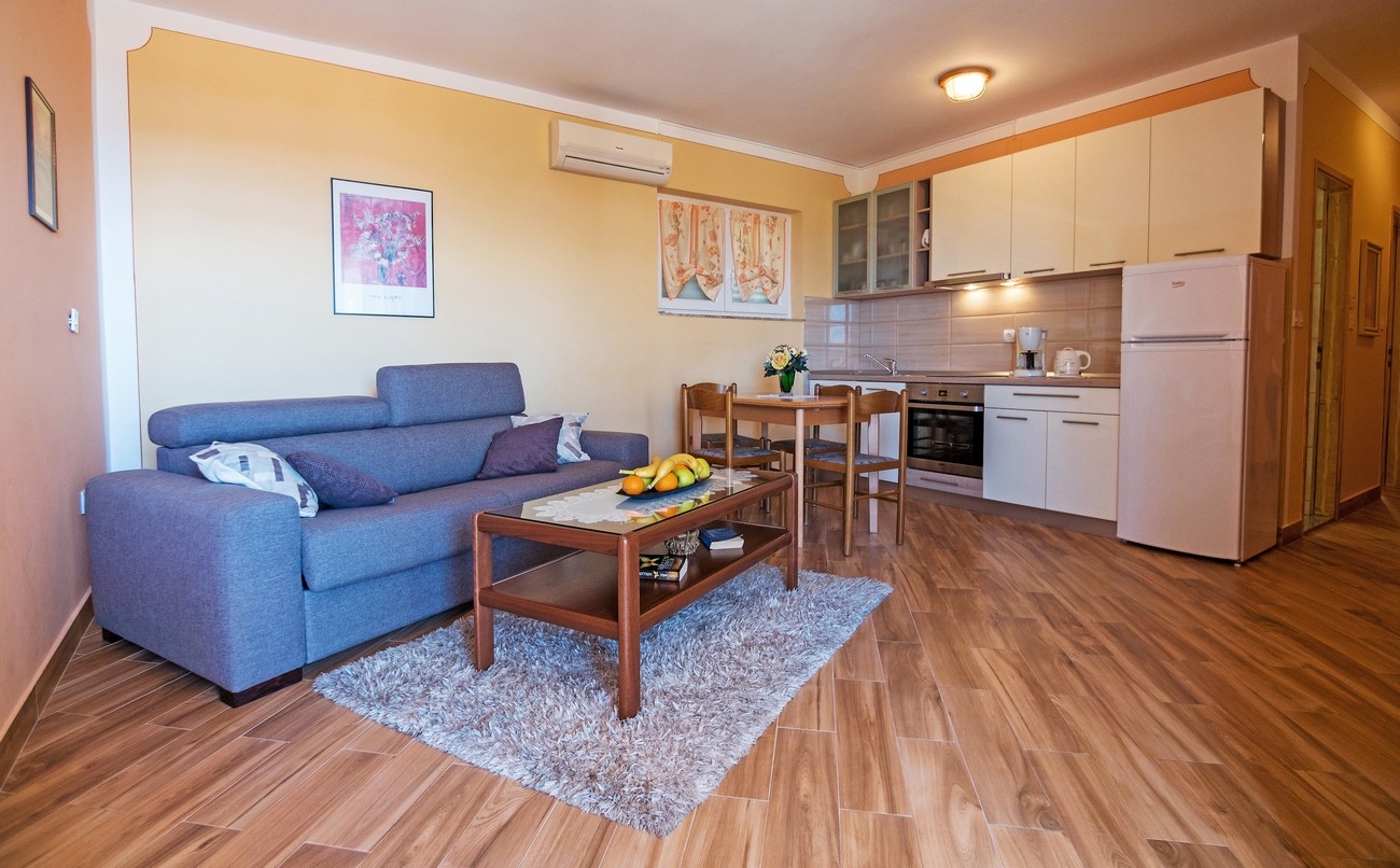 Apartment can accommodate 4 guests. Beds are situated in 1 sleeping rooms, but also in the living room, within 47m2. Guests can use a private terrace to enjoy the warm summer evenings. The apartment offers the sea view. Food can be prepared using barbecue which is shared with other guests too. Shared pool is on disposal during stay. INCLUDED IN THE PRICE: tourist tax, final cleaning, air-conditioning, pool, parking, internet, baby cot, iron, hairdryer, sunshade, sunchairs. OBLIGATORY ADDITIONAL COSTS: short stay fee (surcharge depending on a number of booked nights: 30% - 1, 20% - 2, 10% - 3). OPTIONAL ADDITIONAL COSTS: breakfast (€13.00, a 50% discount for children aged 4 to 12 years, Children up to age 4 free of charge), boat mooring (€5.00 per night), additional bed (€10.00 per night). The availability of additional services for your chosen dates of stay, as well as their prices (if none are listed) must be checked ahead of time. Any additional services not shown in the price calculation are payable directly to the property owner and only if used by the visitor.