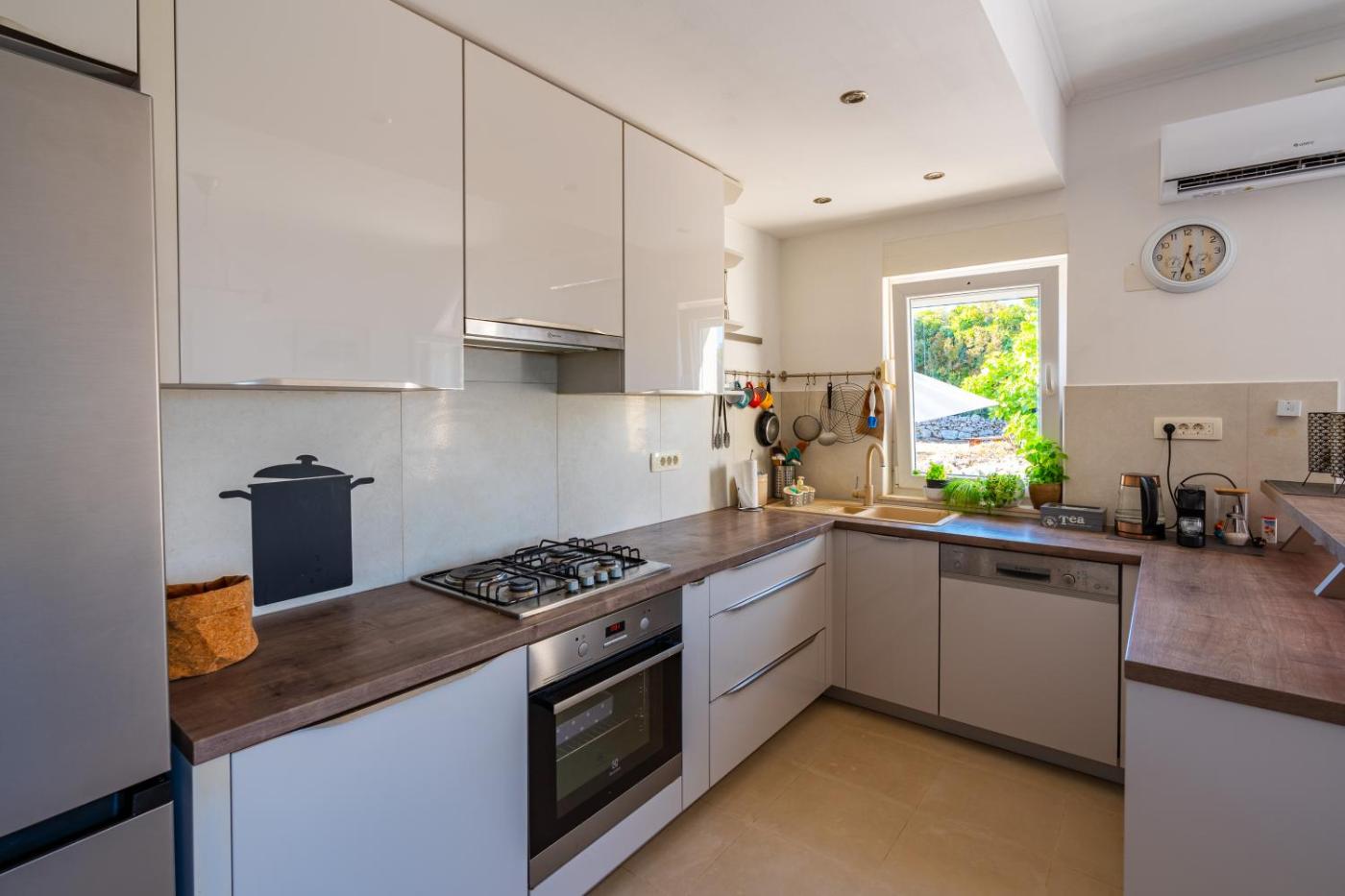 Three-Bedroom House. The fireplace is the standout feature of this holiday home. This spacious holiday home comes with 1 living room, 3 separate bedrooms and 2 bathrooms with a bath and a hairdryer. Guests will find a stovetop, a refrigerator, a dishwasher and an oven in the kitchen. The holiday home also includes a barbecue. The air-conditioned holiday home features a flat-screen TV, a washing machine, a tea and coffee maker, a dining area as well as sea views. The unit has 4 beds.