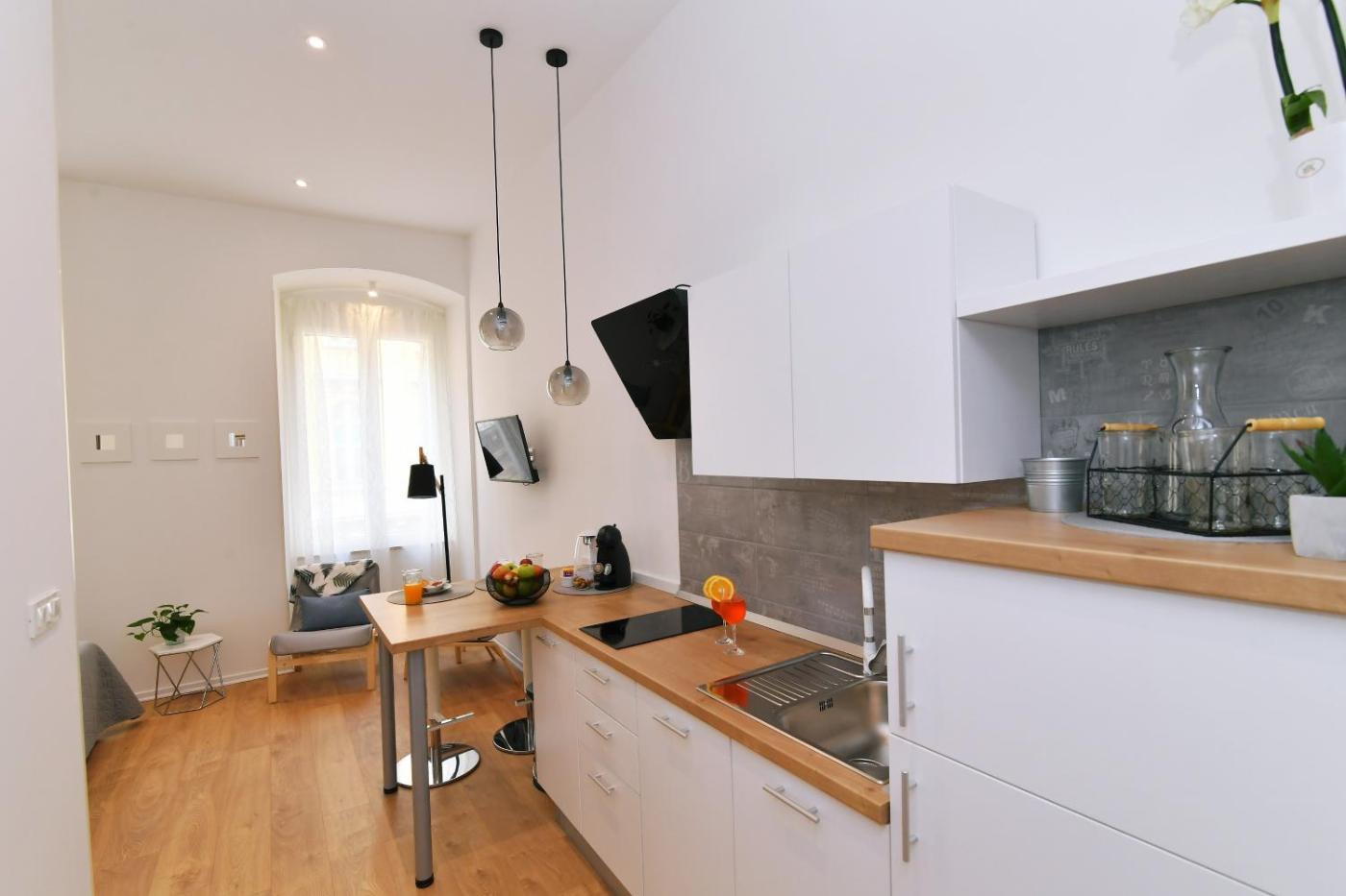 Deluxe Apartment. Featuring a private entrance, this air-conditioned apartment comprises 1 living room, 1 separate bedroom and 1 bathroom with a walk-in shower and a hairdryer. Guests can make meals in the kitchen that comes with a stovetop, a refrigerator, a dishwasher and kitchenware. Boasting a balcony with city views, this apartment also provides a coffee machine and a flat-screen TV. The unit offers 2 beds. ;