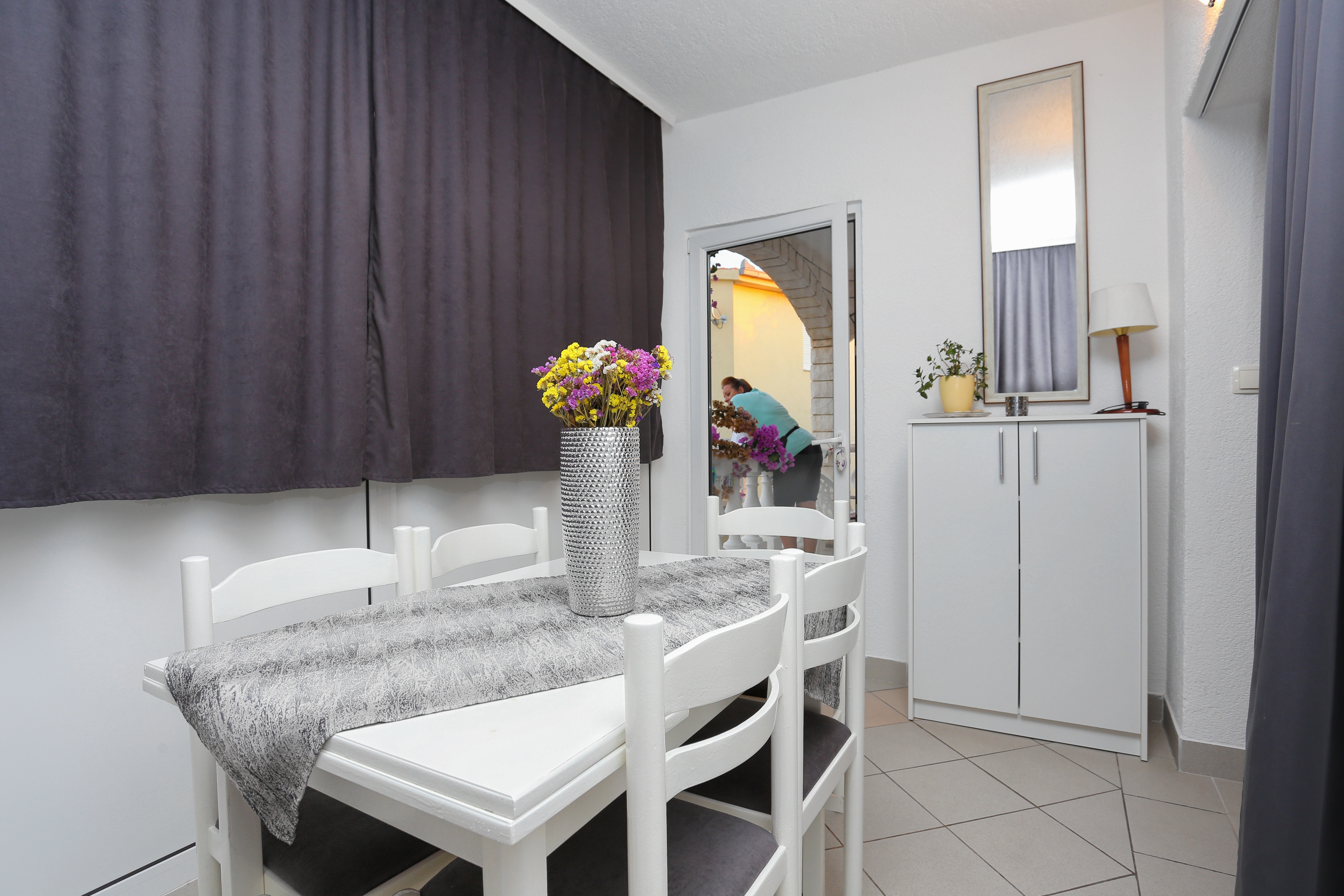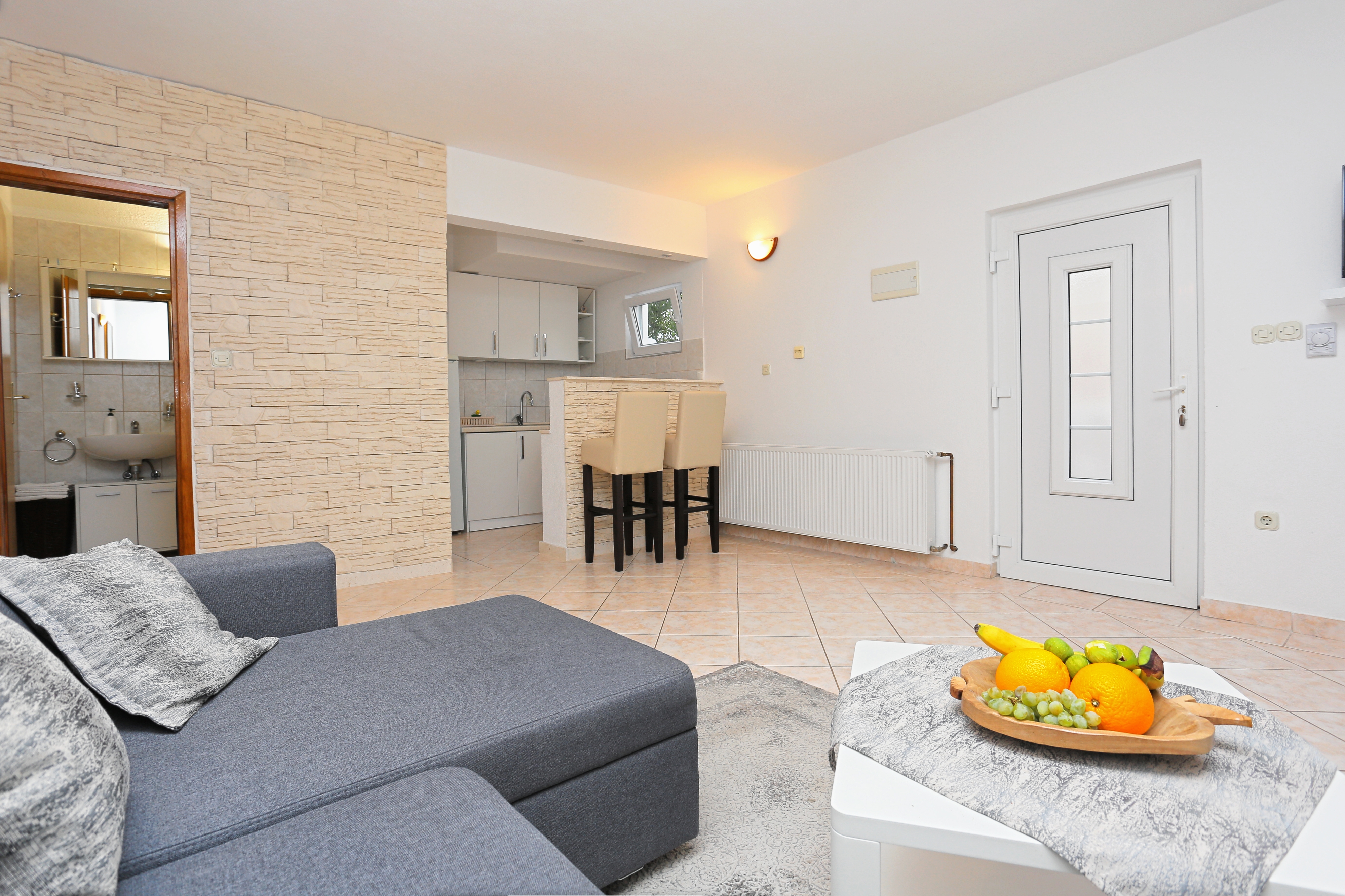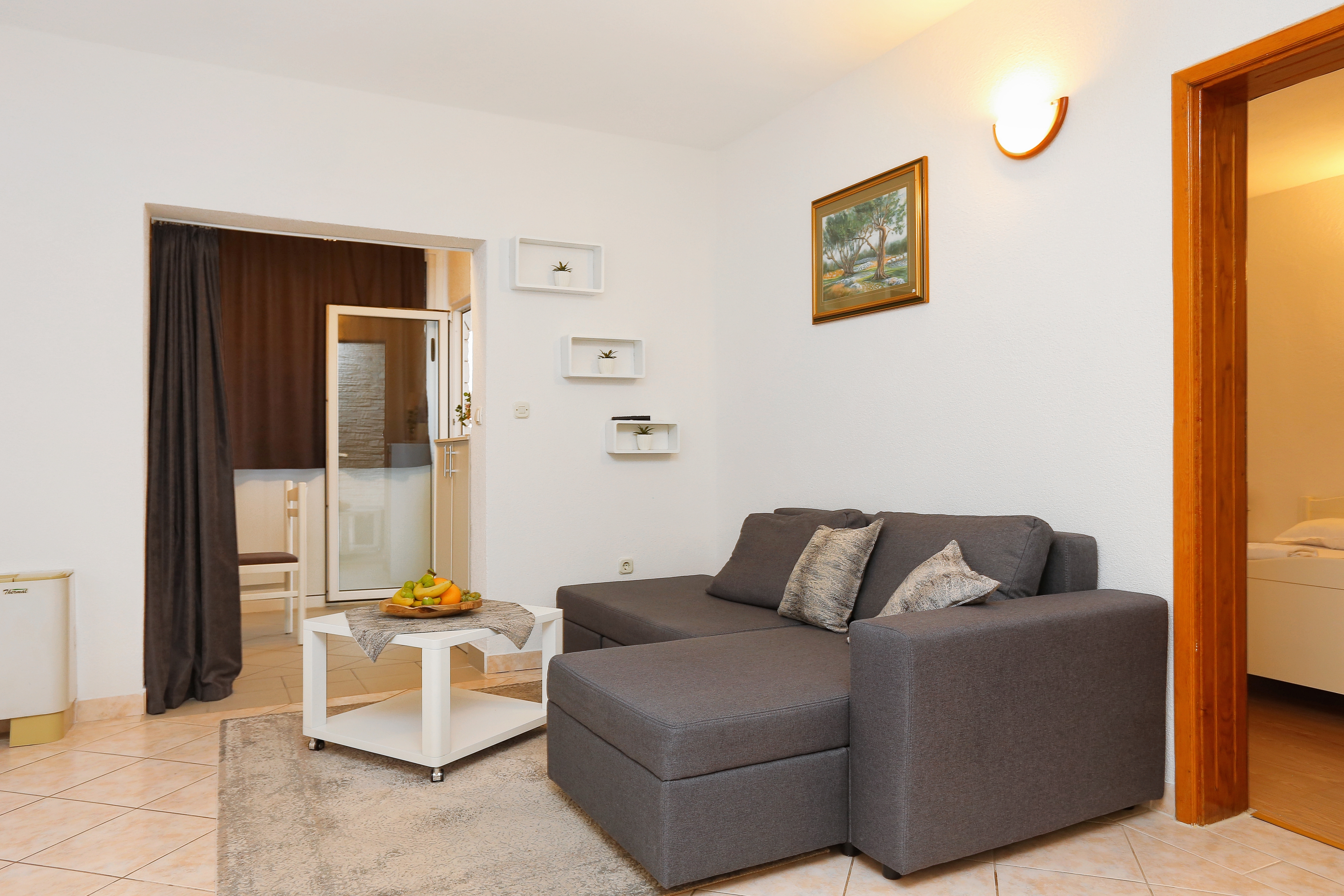 Apartment can accommodate 6 guests. Beds are situated in 2 sleeping rooms, but also in the living room, within 53m2. Guests can use a private terrace to enjoy the warm summer evenings. Food can be prepared using barbecue which is shared with other guests too. INCLUDED IN THE PRICE: tourist tax, final cleaning, air-conditioning, parking, internet, baby cot, iron, ironing board. OBLIGATORY ADDITIONAL COSTS: short stay fee (surcharge depending on a number of booked nights: 30% - 1, 20% - 2, 10% - 3). OPTIONAL ADDITIONAL COSTS: laundry (€1.00 washing). The availability of additional services for your chosen dates of stay, as well as their prices (if none are listed) must be checked ahead of time. Any additional services not shown in the price calculation are payable directly to the property owner and only if used by the visitor.