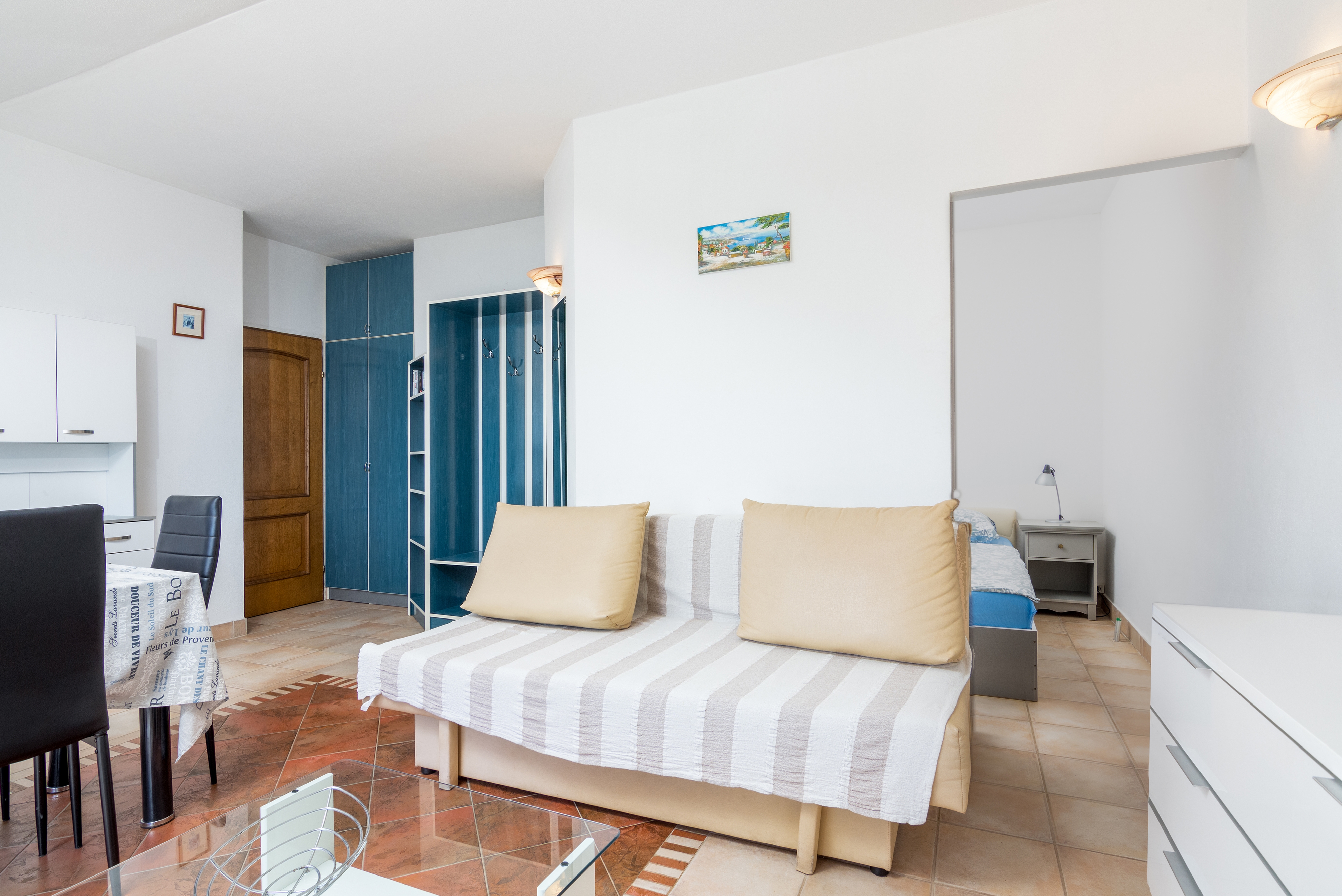 Studio flat can accommodate 4 guests. Beds are situated in 2 sleeping rooms, within 42m2. Guests can use a private terrace to enjoy the warm summer evenings. INCLUDED IN THE PRICE: tourist tax, final cleaning, air-conditioning, internet, laundry, iron, ironing board, hairdryer. OBLIGATORY ADDITIONAL COSTS: short stay fee (surcharge depending on a number of booked nights: 30% - 1, 20% - 2, 10% - 3). The availability of additional services for your chosen dates of stay, as well as their prices (if none are listed) must be checked ahead of time. Any additional services not shown in the price calculation are payable directly to the property owner and only if used by the visitor. Discounts to the base price: free day 14=13 (for reservations of 14 or more days you get one free day for the stay until 31122026).