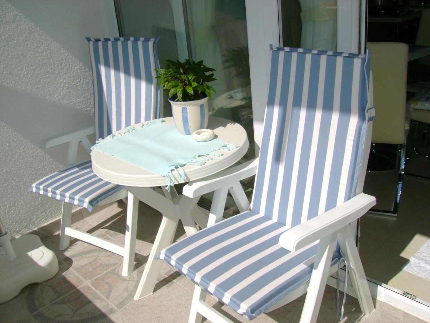 The apartment has 1 bedroom, 1 bathroom, bed linen, towels, a flat-screen TV with cable channels, a dining area, a fully equipped kitchen, and a balcony with sea views. Additional in-room amenities include fruits.