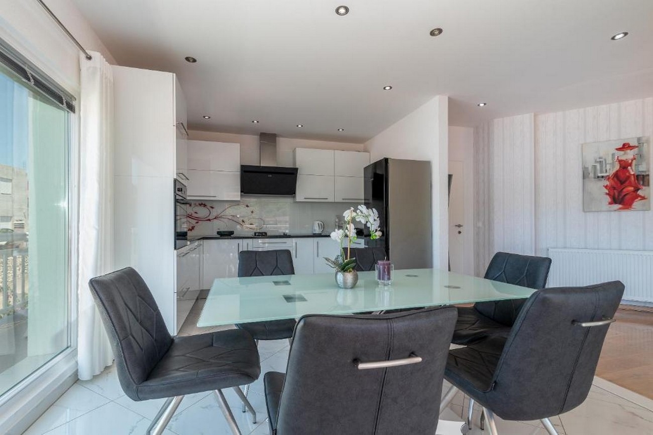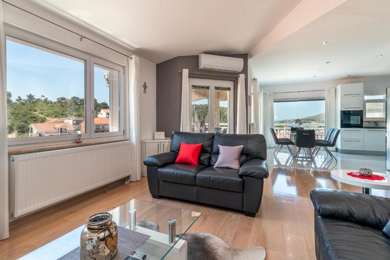 Apartment can accommodate 6 guests. Beds are situated in 3 sleeping rooms, within 93m2. Guests can use a private terrace to enjoy the warm summer evenings. The apartment offers the sea view. Food can be prepared using barbecue which is shared with other guests too. Shared pool is on disposal during stay. INCLUDED IN THE PRICE: tourist tax, final cleaning, air-conditioning, pool, parking, garage, internet, laundry, iron, ironing board, hairdryer, sunchairs. The availability of additional services for your chosen dates of stay, as well as their prices (if none are listed) must be checked ahead of time. Any additional services not shown in the price calculation are payable directly to the property owner and only if used by the visitor.