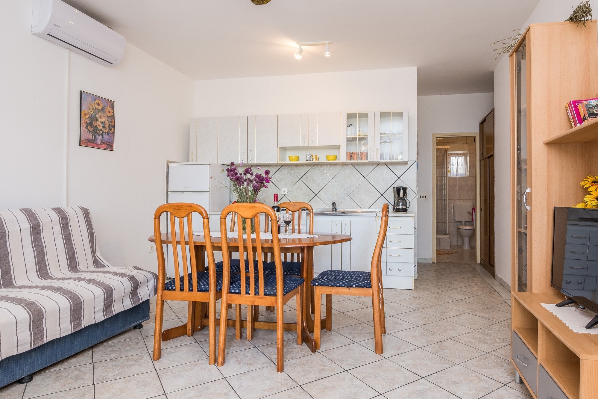 Apartment can accommodate 4 guests. Beds are situated in 1 sleeping rooms, but also in the living room, within 34m2. Guests can use a private terrace to enjoy the warm summer evenings. The apartment offers the sea view. Food can be prepared using barbecue which is shared with other guests too. INCLUDED IN THE PRICE: tourist tax, final cleaning, air-conditioning, internet, baby cot, hairdryer. OBLIGATORY ADDITIONAL COSTS: short stay fee (surcharge depending on a number of booked nights: 30% - 1, 20% - 2, 10% - 3). The availability of additional services for your chosen dates of stay, as well as their prices (if none are listed) must be checked ahead of time. Any additional services not shown in the price calculation are payable directly to the property owner and only if used by the visitor.
