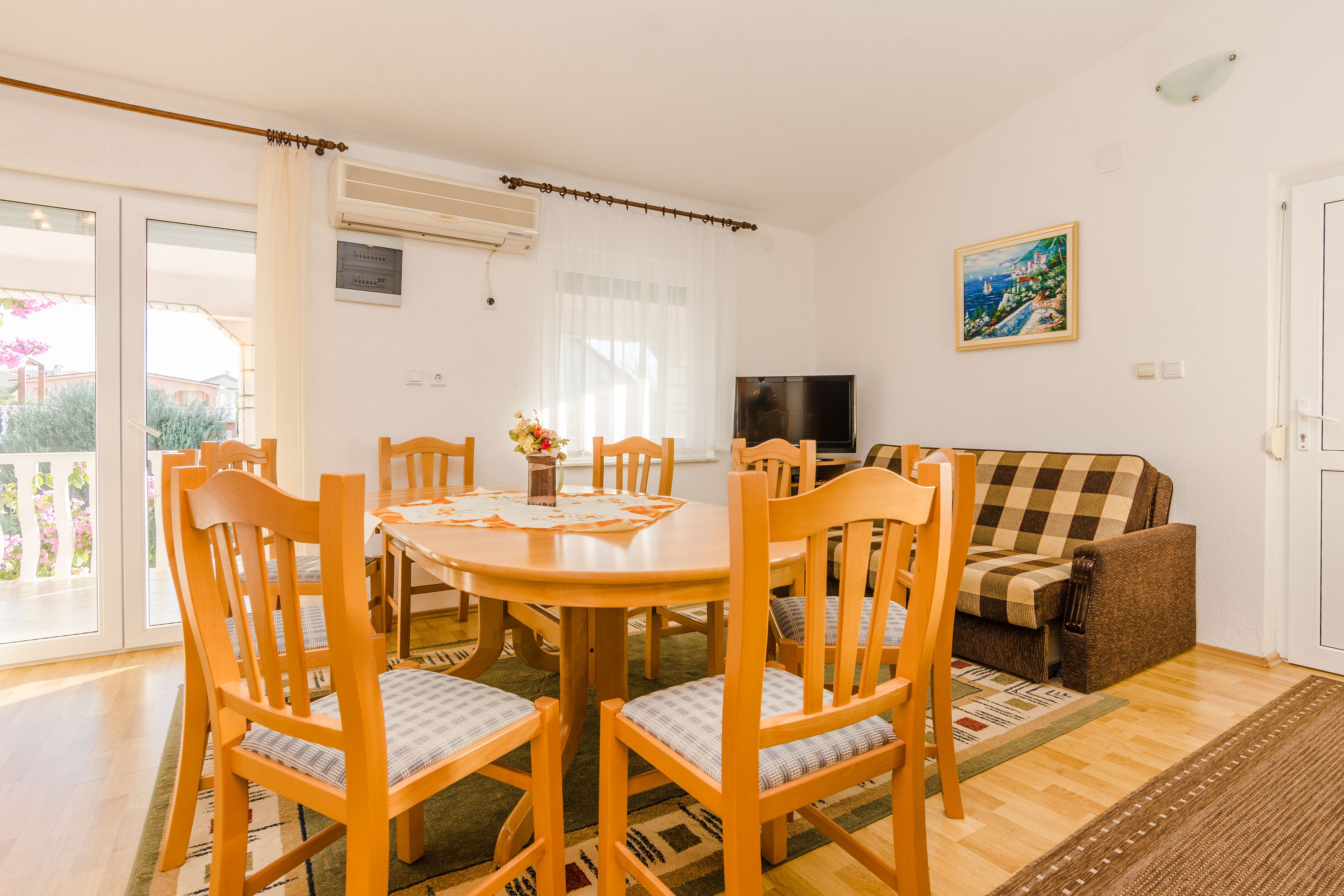 Apartment can accommodate 8 guests. Beds are situated in 3 sleeping rooms, but also in the dining room, within 65m2. Guests can use a private balcony to enjoy the warm summer evenings. Food can be prepared using barbecue which is shared with other guests too. INCLUDED IN THE PRICE: tourist tax, final cleaning, air-conditioning, parking, internet, iron, ironing board, hairdryer. OBLIGATORY ADDITIONAL COSTS: short stay fee (surcharge depending on a number of booked nights: 30% - 1, 20% - 2, 10% - 3). The availability of additional services for your chosen dates of stay, as well as their prices (if none are listed) must be checked ahead of time. Any additional services not shown in the price calculation are payable directly to the property owner and only if used by the visitor.