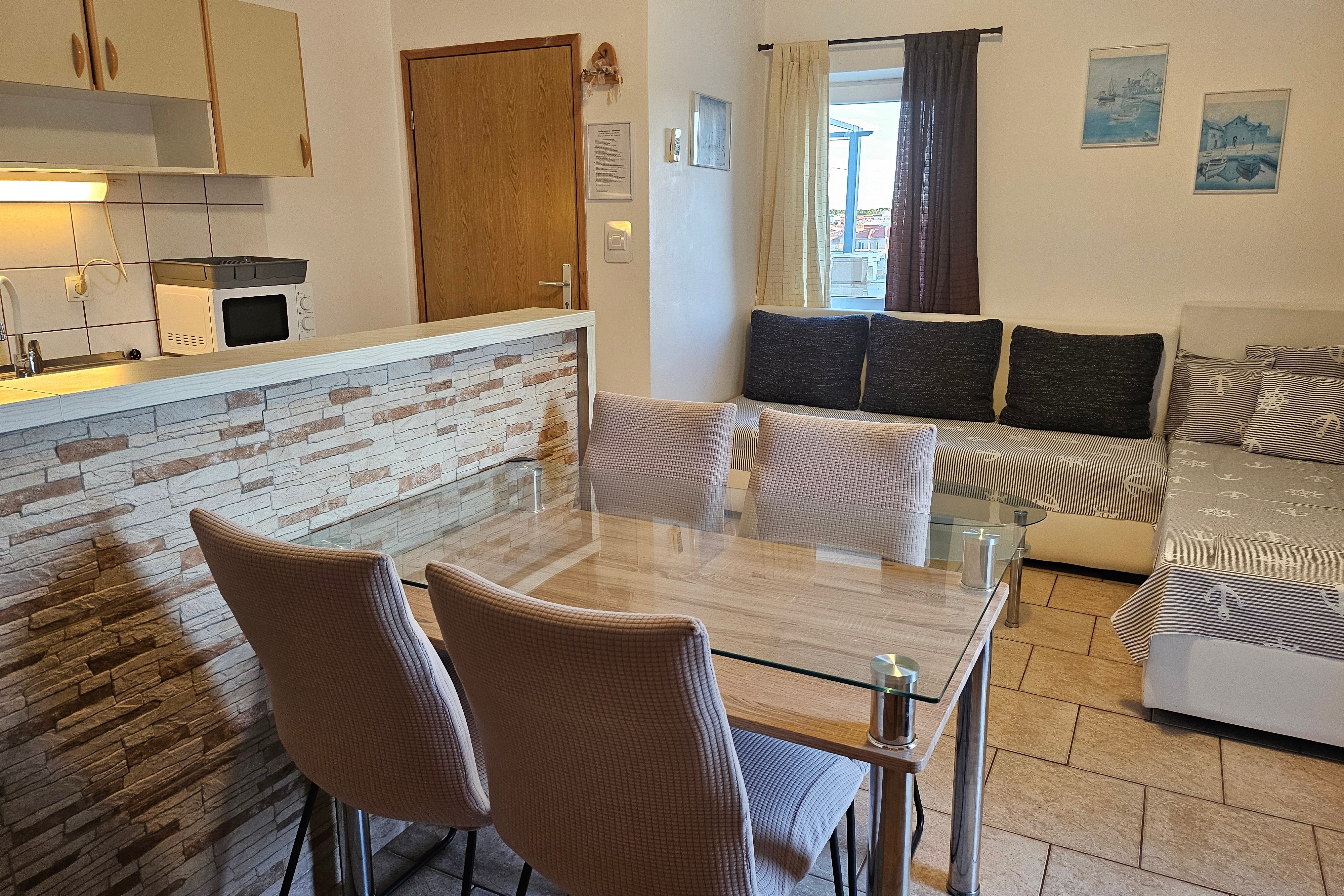 Apartment can accommodate 4 guests. Beds are situated in 2 sleeping rooms, within 38m2. Guests can use a private terrace to enjoy the warm summer evenings. The apartment offers the sea view. Food can be prepared using barbecue which is shared with other guests too. This accommodation unit welcomes pets at an additional charge. INCLUDED IN THE PRICE: tourist tax, final cleaning, air-conditioning, parking, internet, baby cot, iron, ironing board, hairdryer. OBLIGATORY ADDITIONAL COSTS: short stay fee (surcharge depending on a number of booked nights: 30% - 1, 20% - 2, 10% - 3). OPTIONAL ADDITIONAL COSTS: pets (€10.00 per night). The availability of additional services for your chosen dates of stay, as well as their prices (if none are listed) must be checked ahead of time. Any additional services not shown in the price calculation are payable directly to the property owner and only if used by the visitor.