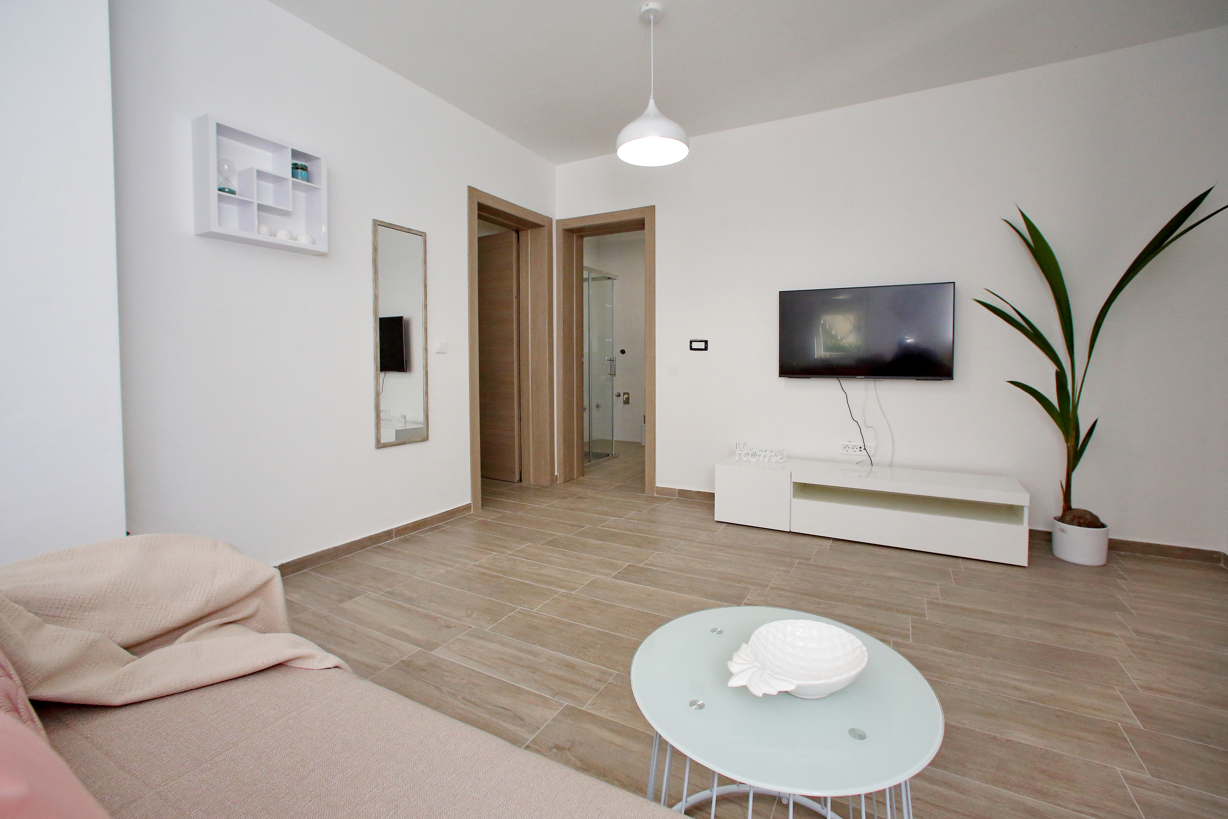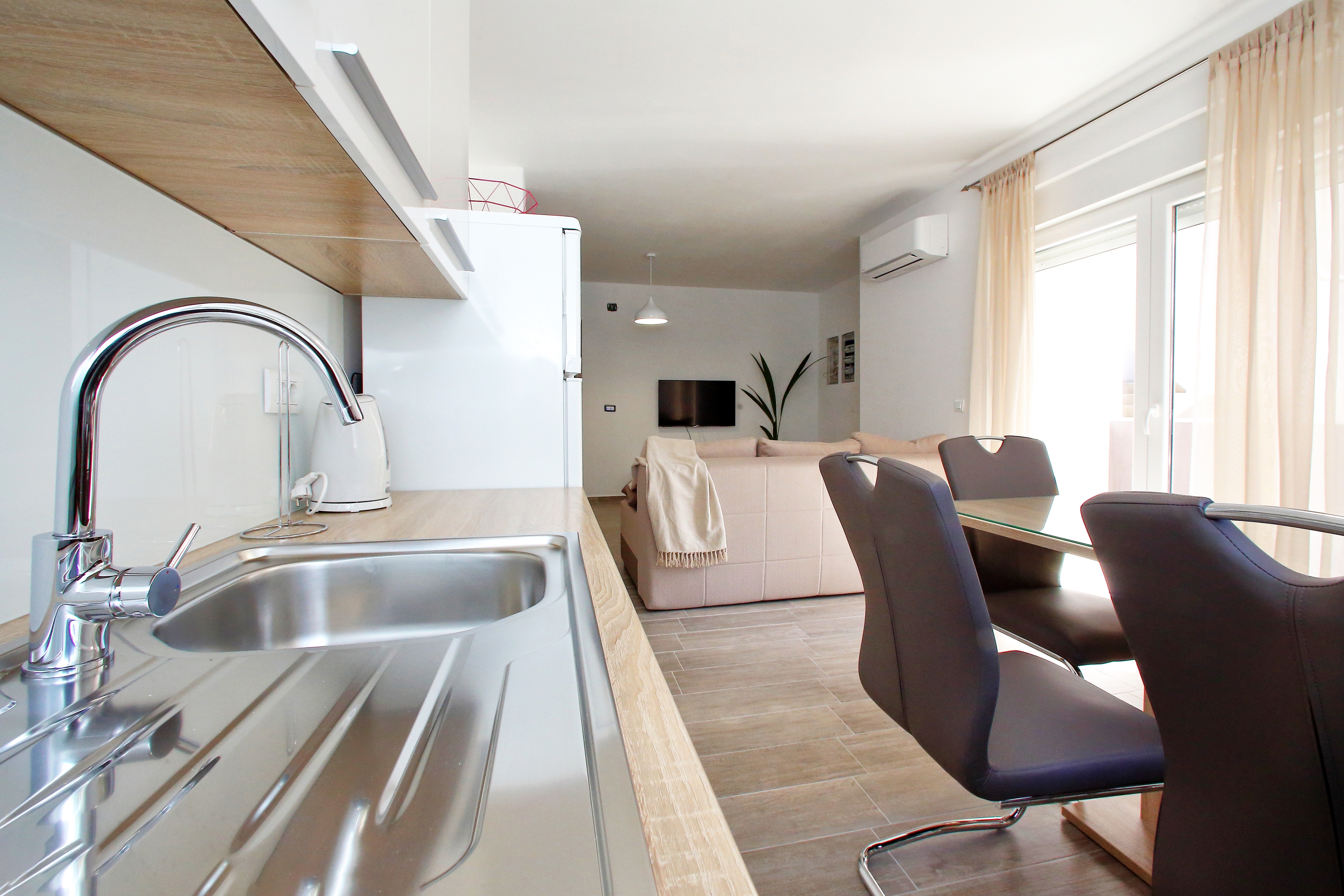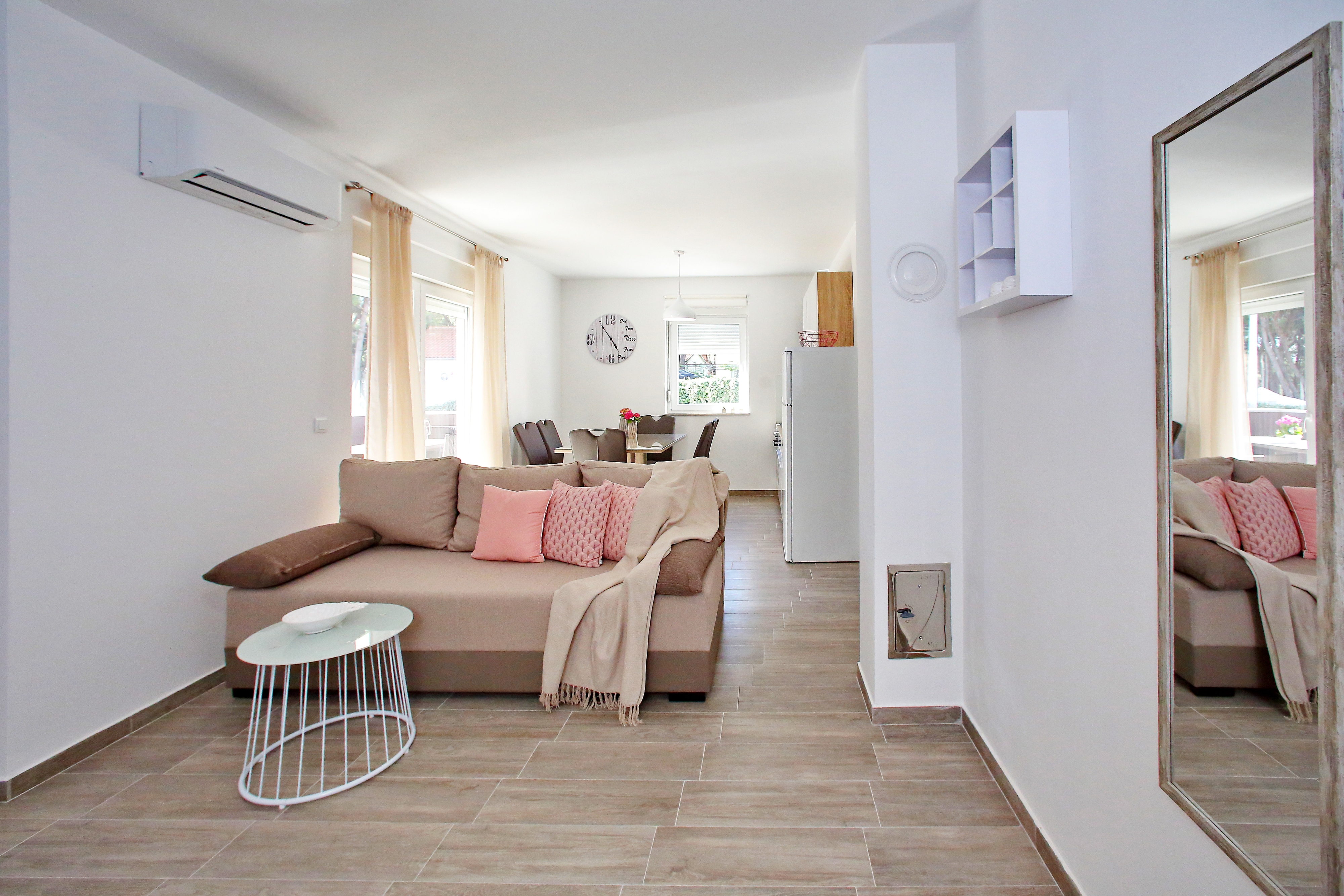 Apartment can accommodate 4 guests. Beds are situated in 2 sleeping rooms, within 46m2. Guests can use a private balcony to enjoy the warm summer evenings. Food can be prepared using barbecue which is shared with other guests too. INCLUDED IN THE PRICE: tourist tax, final cleaning, air-conditioning, parking, internet, baby cot, iron, ironing board, hairdryer, 1 bed for children (included in the price). OPTIONAL ADDITIONAL COSTS: laundry (€5.00 washing). The availability of additional services for your chosen dates of stay, as well as their prices (if none are listed) must be checked ahead of time. Any additional services not shown in the price calculation are payable directly to the property owner and only if used by the visitor.