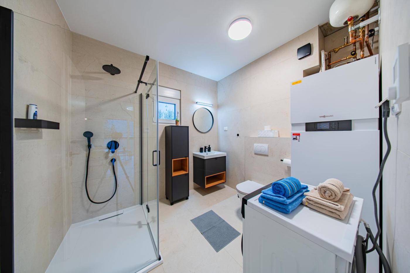 One-Bedroom Apartment with Balcony. Featuring a private entrance, this air-conditioned apartment consists of 1 living room, 1 separate bedroom and 1 bathroom with a walk-in shower and a hairdryer. Guests can make meals in the kitchen that is equipped with a stovetop, a refrigerator, kitchenware and an oven. The apartment provides a washing machine, soundproof walls, a seating area as well as a terrace with city views. The unit offers 2 beds.